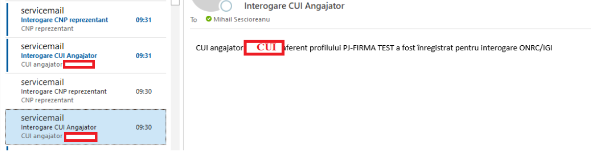 Un mail prin care utilizatorul este informat ca a fost transmisa solicitarea de interogare a bazei de date ONRC pentru CUI-ul introdus