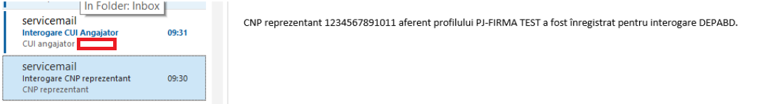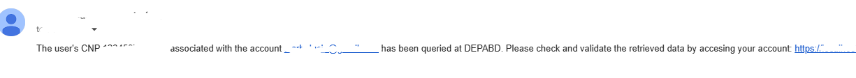 Un mail prin care utilizatorul este informat ca a fost transmisa solicitarea de interogare a bazei de date DEPABD/IGI pentru CNP-ul reprezentantului legal